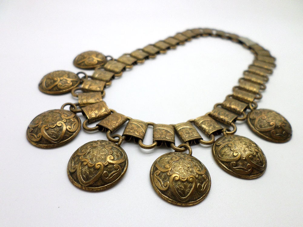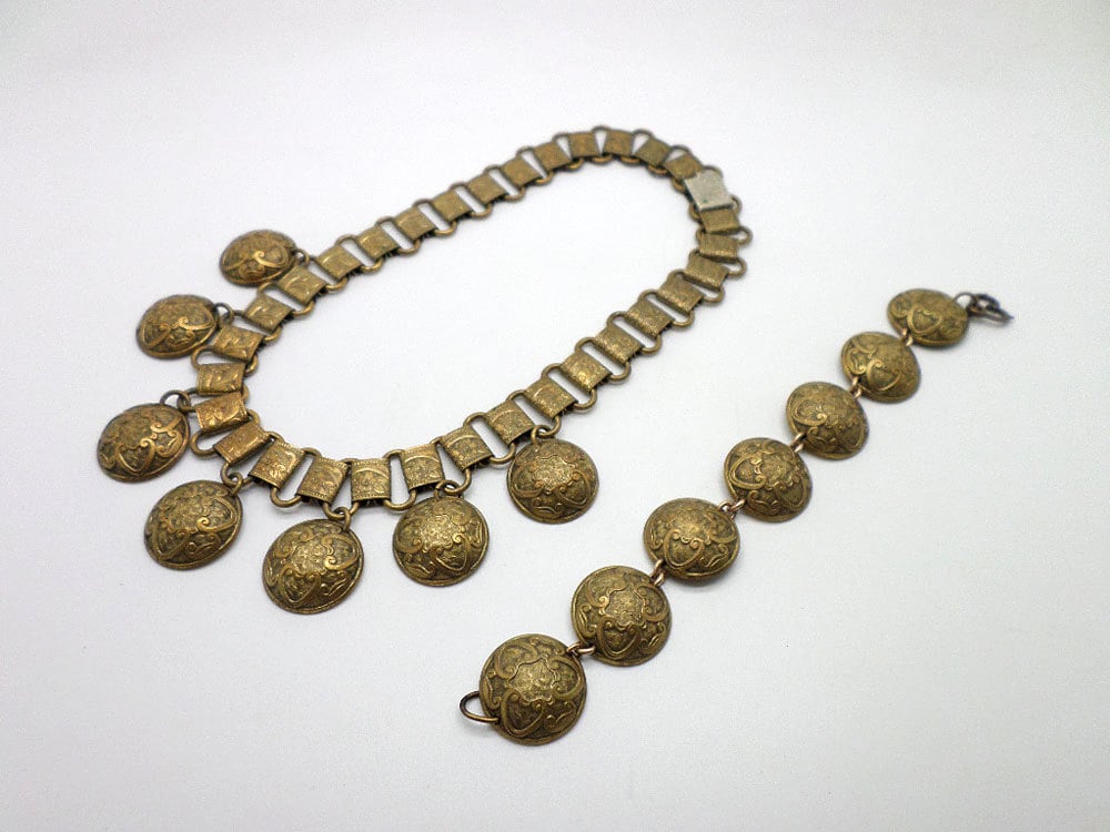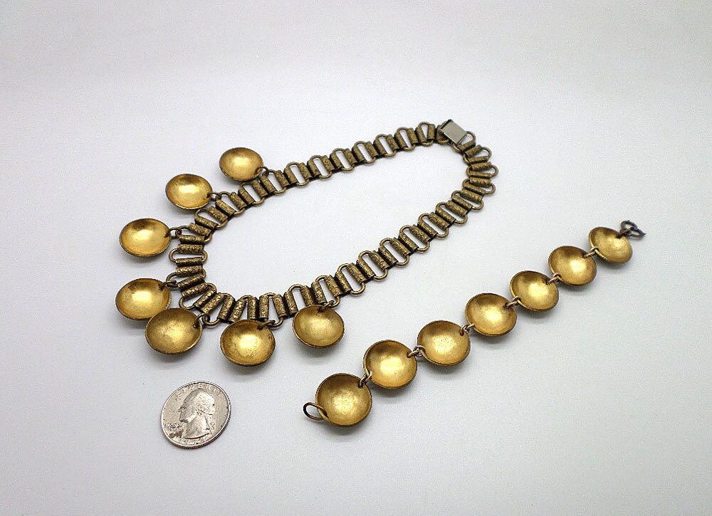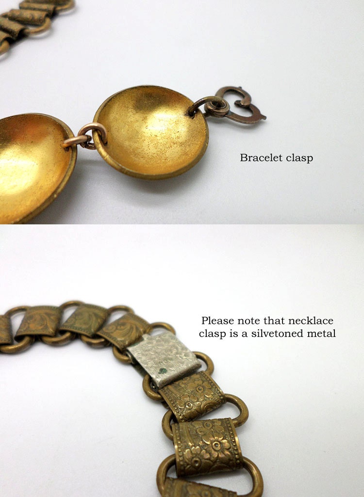 FAB aged brass necklace and bracelet set. Necklace is shorter, choker length. Both the large bookchain style links and domes are beautifully detailed. Both pieces show a darkening to the metal and some patina. The backs are much brighter brass. The necklace clasp is a silver tone metal. (Perhaps not for the perfectionist!)