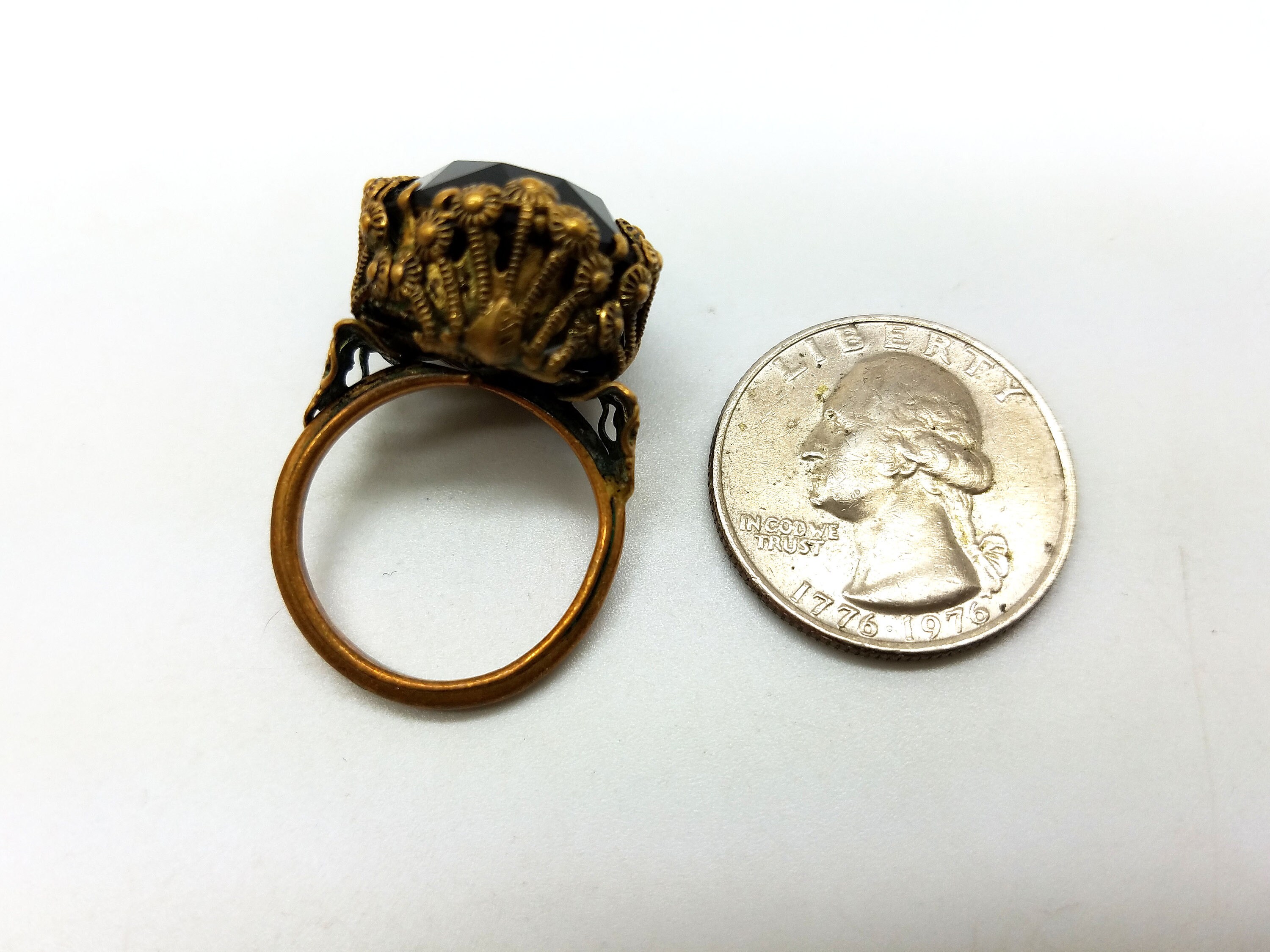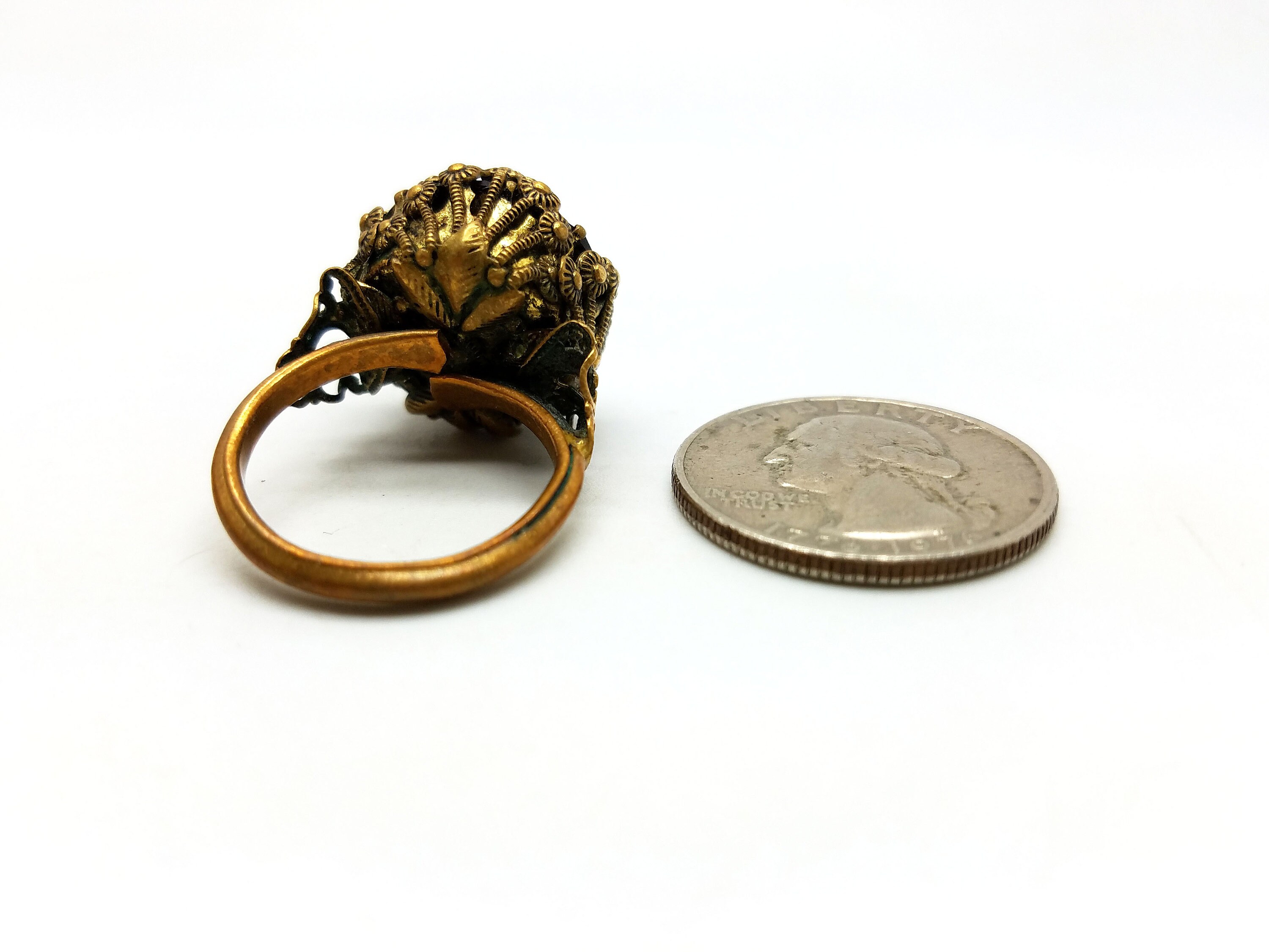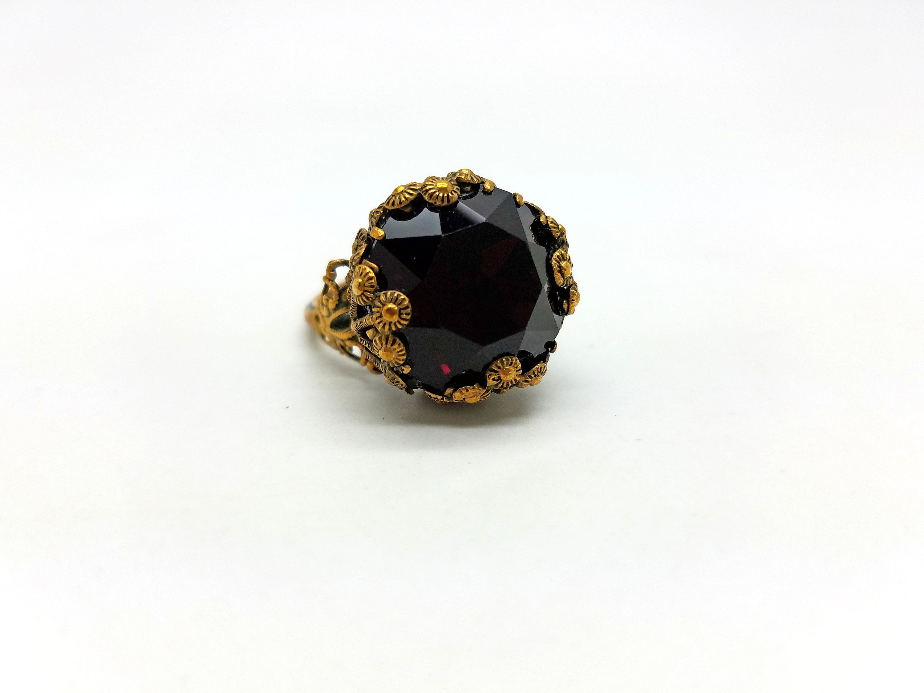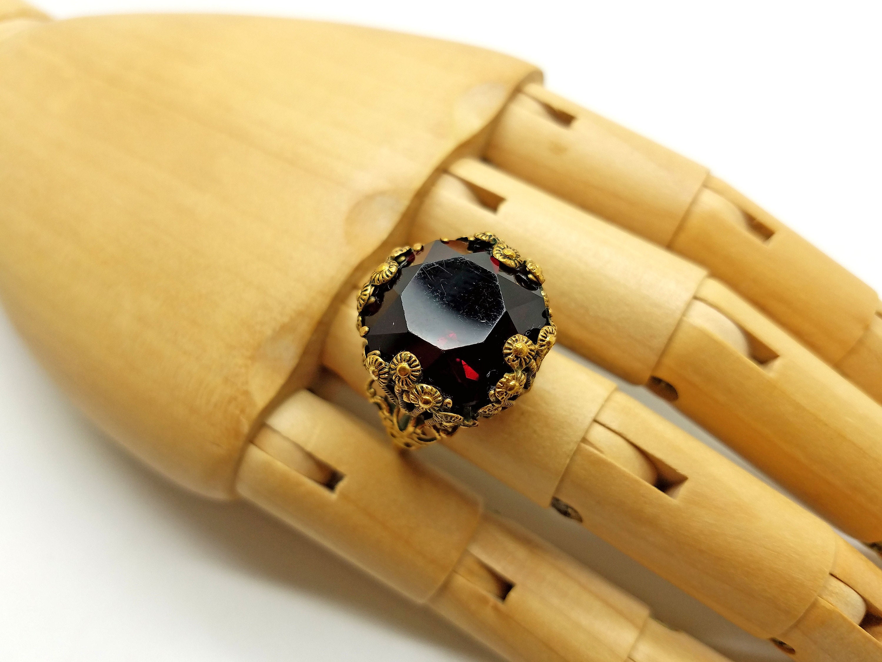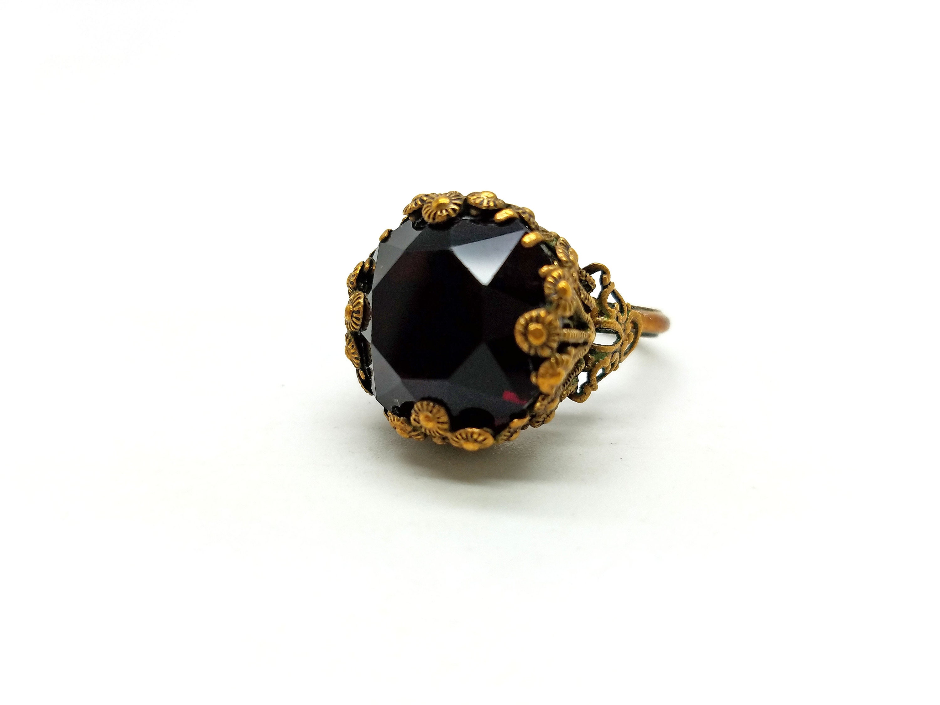 Deep red and brass costume ring. Ornate setting. Aged brass with patina. Super fun to wear!!!