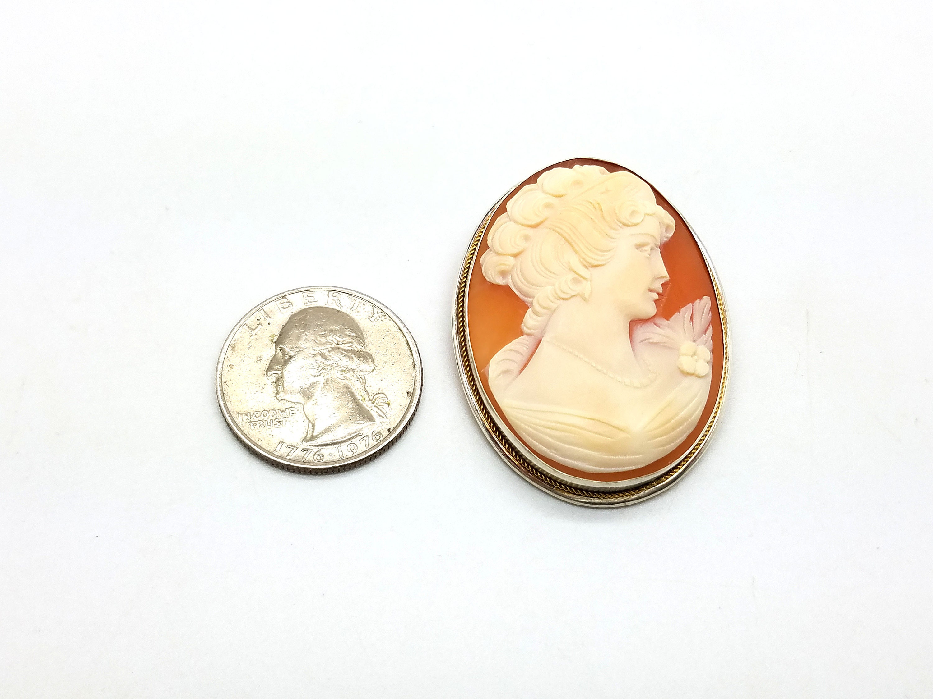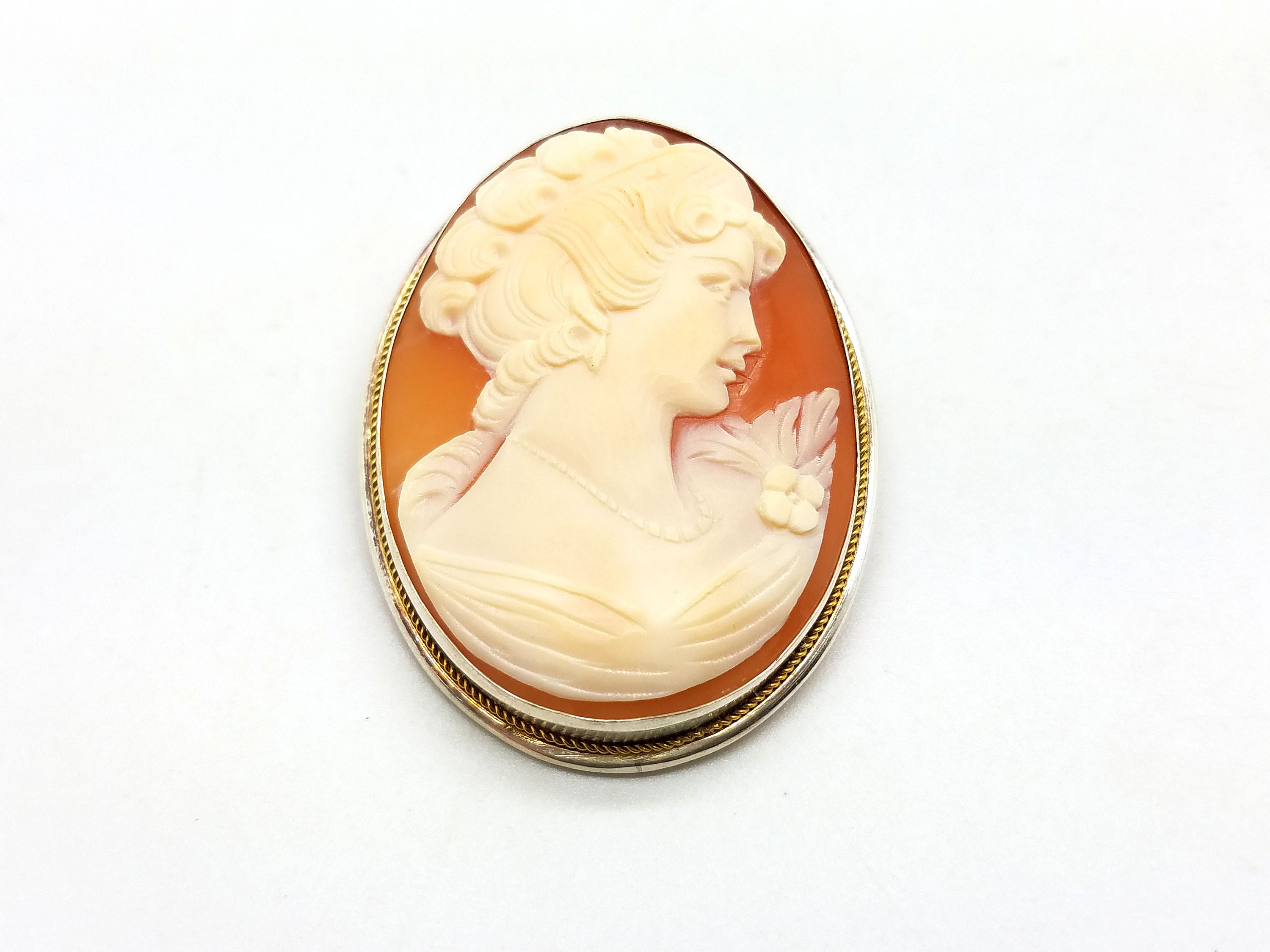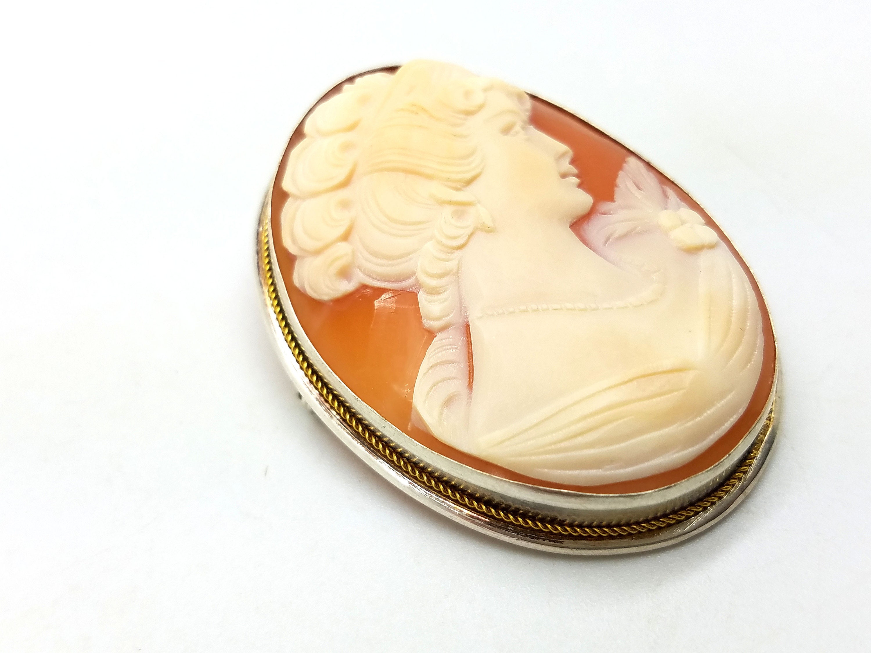 A gorgeous Cameo brooch. She is so PRETTY, carved from shell. With a gold vermeil twisted accent around the bezel. Great big size at approx. 1 3/4" by 1 1/4". Can be worn as a pendant too!!! Bale folds down into pin when in use as a pin. She is also lightweight and easy to wear...either on a chain or as a pin.
