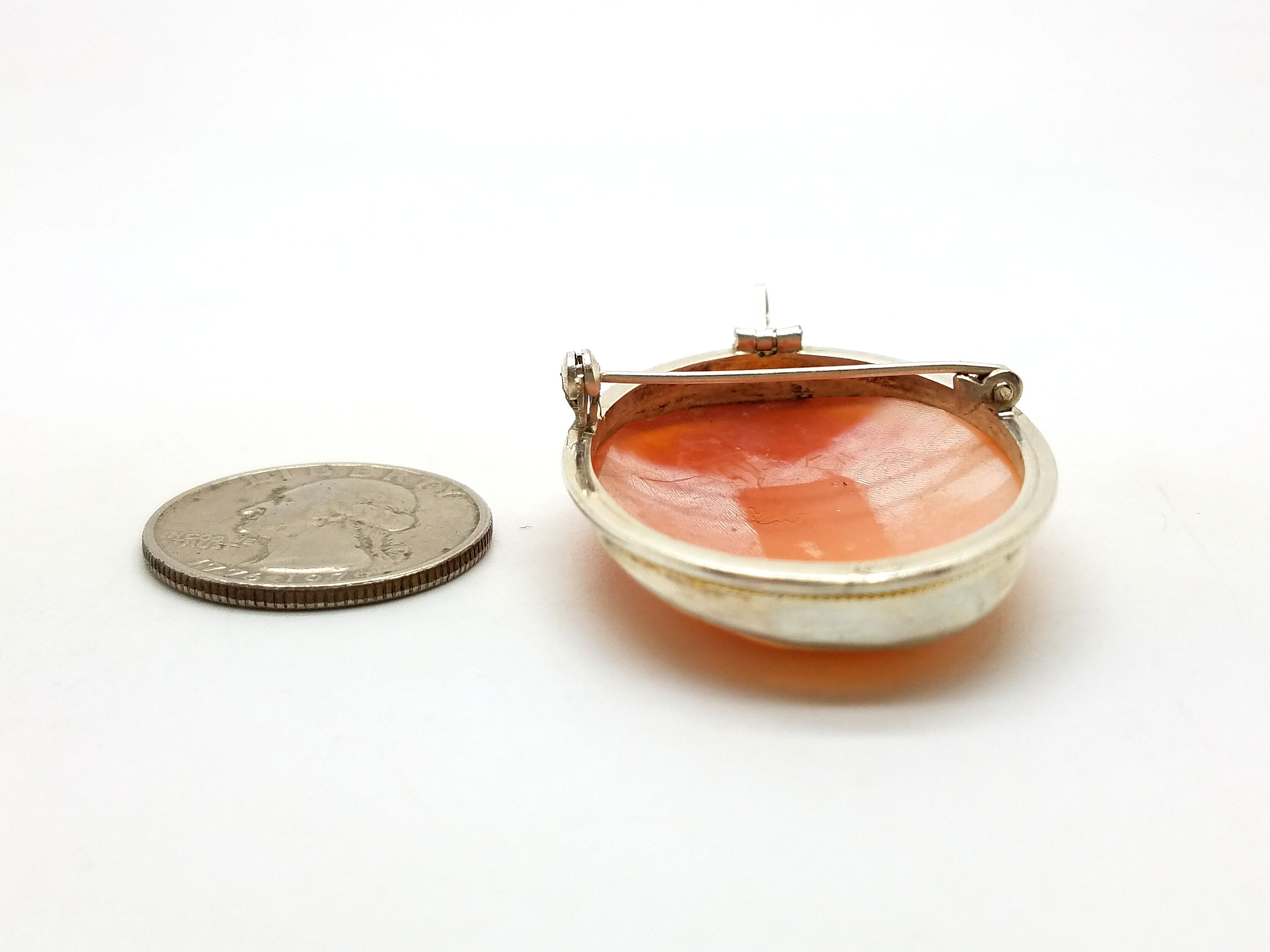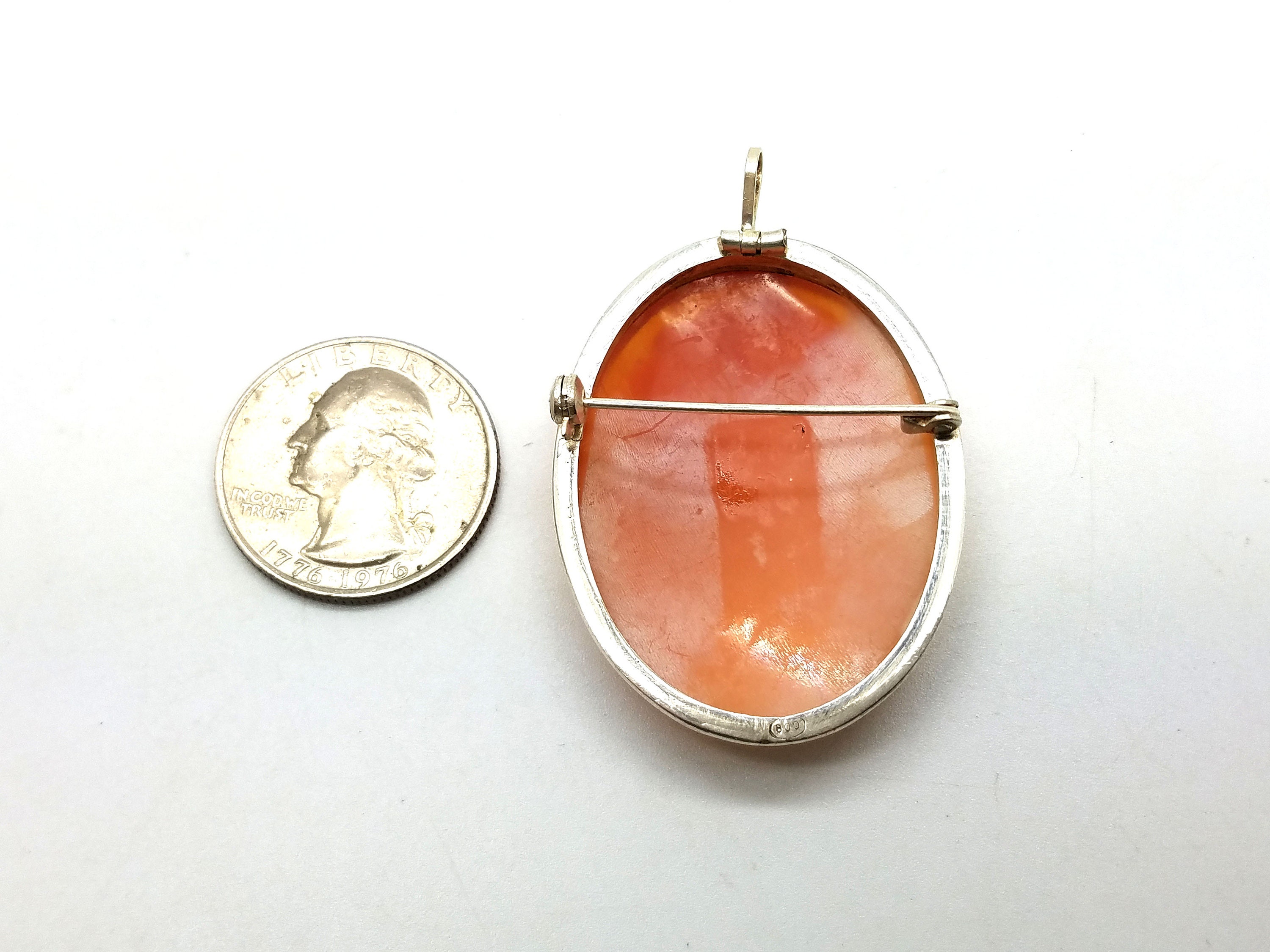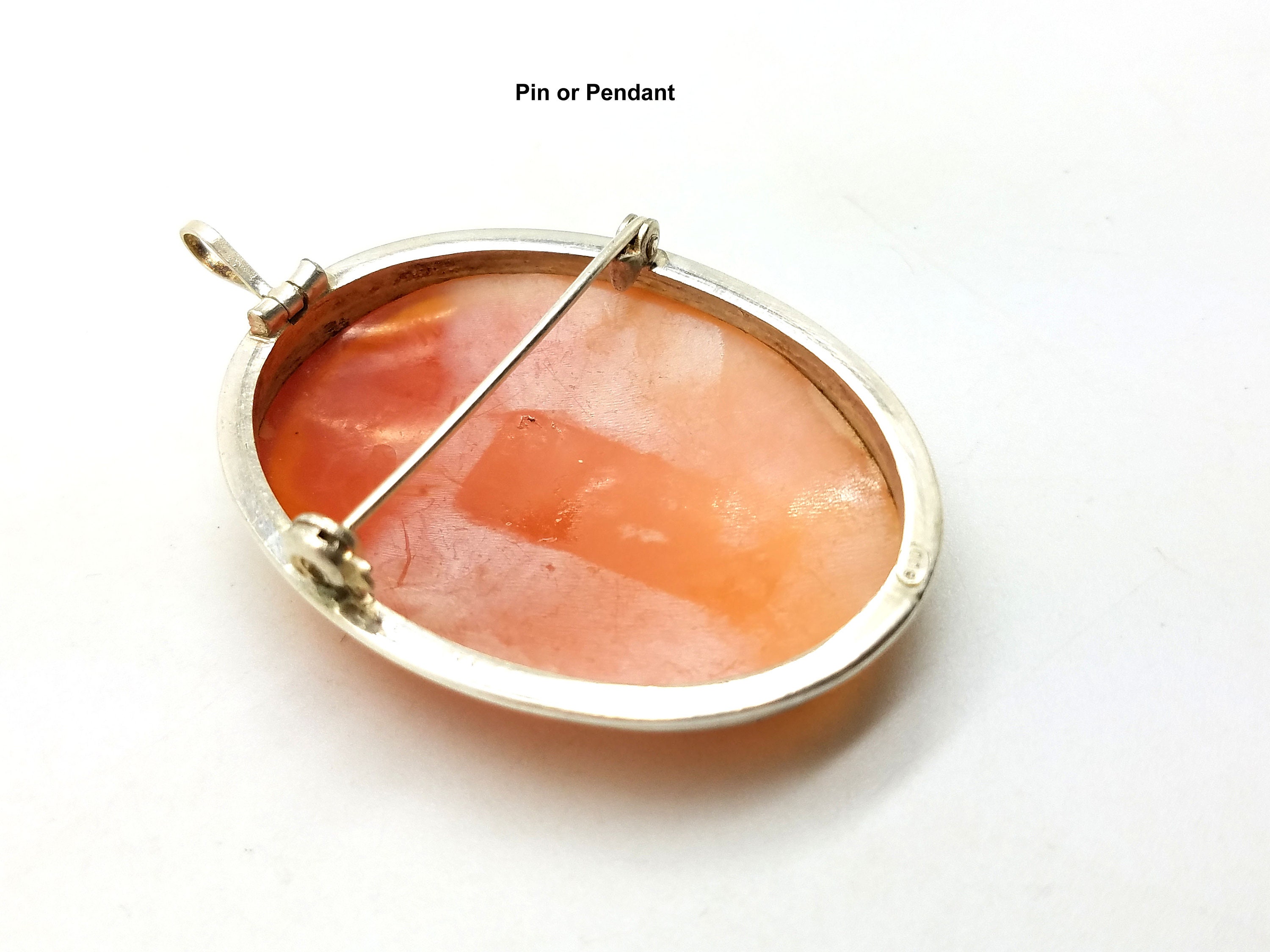 A gorgeous Cameo brooch. She is so PRETTY, carved from shell. With a gold vermeil twisted accent around the bezel. Great big size at approx. 1 3/4" by 1 1/4". Can be worn as a pendant too!!! Bale folds down into pin when in use as a pin. She is also lightweight and easy to wear...either on a chain or as a pin.